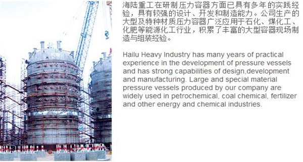 蘇州海陸重工股份有限公司位于江蘇省張家港市開發(fā)區(qū),是國內(nèi)一流的節(jié)能環(huán)保設(shè)備的專業(yè)設(shè)計制造企業(yè),目前并已初步形成鍋爐產(chǎn)品、大型壓力容器、核電設(shè)備、低溫產(chǎn)品、環(huán)保工程共同發(fā)展的業(yè)務(wù)格局。公司創(chuàng)建于1956年,注冊資本51640萬元,占地面積近50萬平米。公司下設(shè)八個控股子公司,一個余熱鍋爐研究所,在瑞士、北京、武漢、南京、上海、杭州、廣州等地設(shè)立分支機構(gòu),擁有雄厚的研發(fā)實力。公司秉承“科技領(lǐng)航、業(yè)界先鋒”的發(fā)展理念,注重研究廢熱、余熱利用和環(huán)境保護(hù)相結(jié)合的新技術(shù)研發(fā),自主設(shè)計能力居同行前列;公司承擔(dān)過國家863計劃,江蘇省科技成果轉(zhuǎn)化專項資金,榮獲國家科技進(jìn)步二等獎,產(chǎn)品擁有核心自主知識產(chǎn)權(quán)并取得專利50多項;公司推行國際先進(jìn)的管理體系標(biāo)準(zhǔn)和認(rèn)證,擁有 A級鍋爐制造許可證,A1、A2、A3級壓力容器設(shè)計和制造許可證,取得了民用核承壓設(shè)備制造資格許可證、美國機械工程師學(xué)會(ASME)“S”、“U”鋼印,通過了ISO9001質(zhì)量體系認(rèn)證、健康體系認(rèn)證和14000環(huán)境體系認(rèn)證;公司設(shè)備先進(jìn),裝備精良,專業(yè)嚴(yán)謹(jǐn)?shù)闹圃炖砟畲蛟斐銎焚|(zhì)非凡、質(zhì)量一流的“海陸”品牌聲譽。